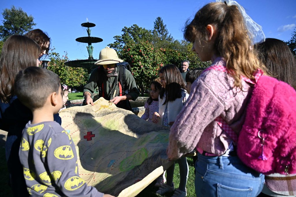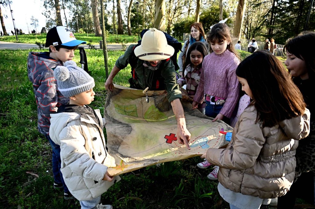 Um aventureiro anda perdido, com bússola e mapa na mão. O que procura? O que observa? O que achas que pode encontrar? O mapa tem uma cruz, há pistas que tem de seguir e superar vários desafios. Que tesouro estará escondido na cruz do mapa? Os tesouros andam por aí…